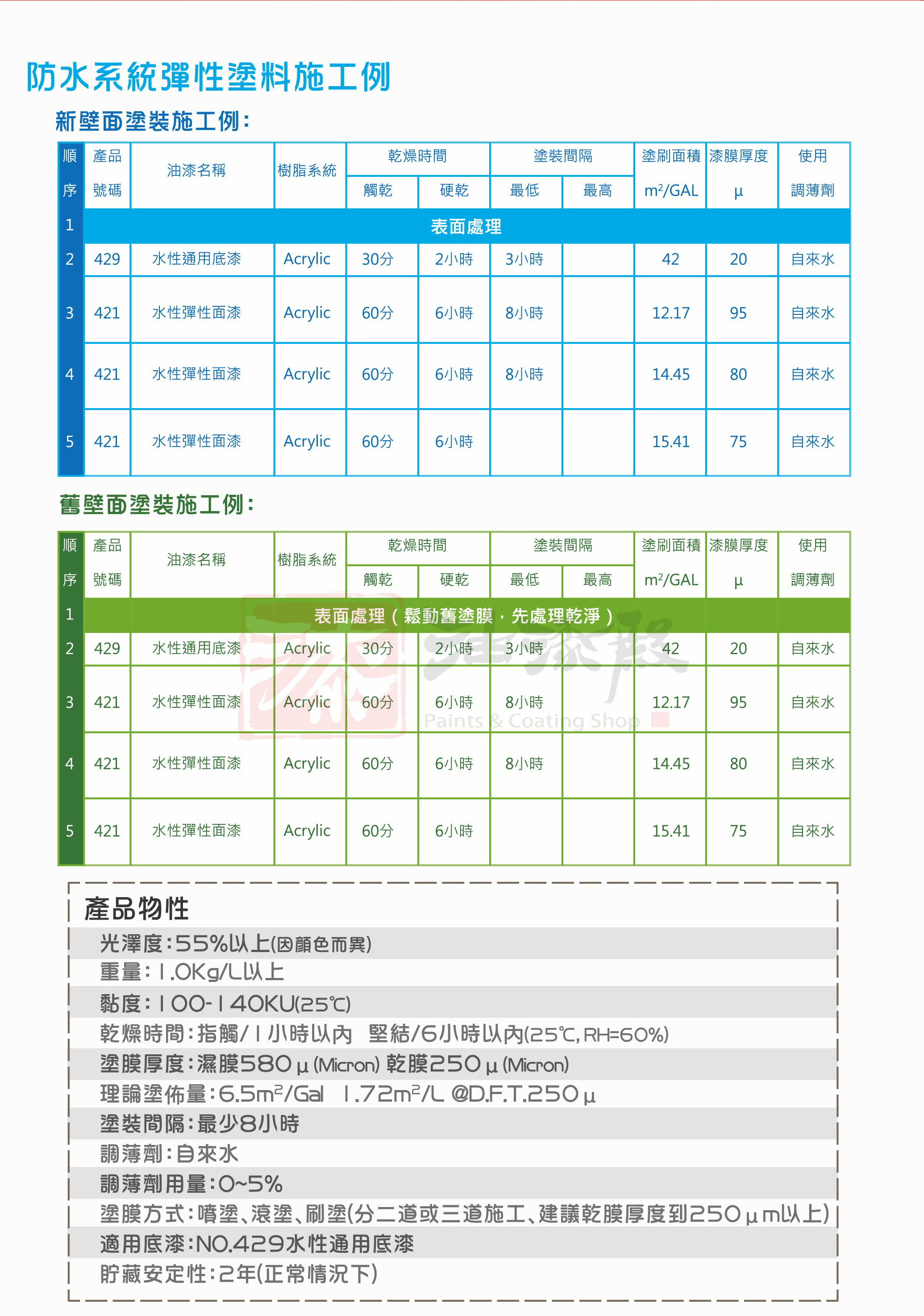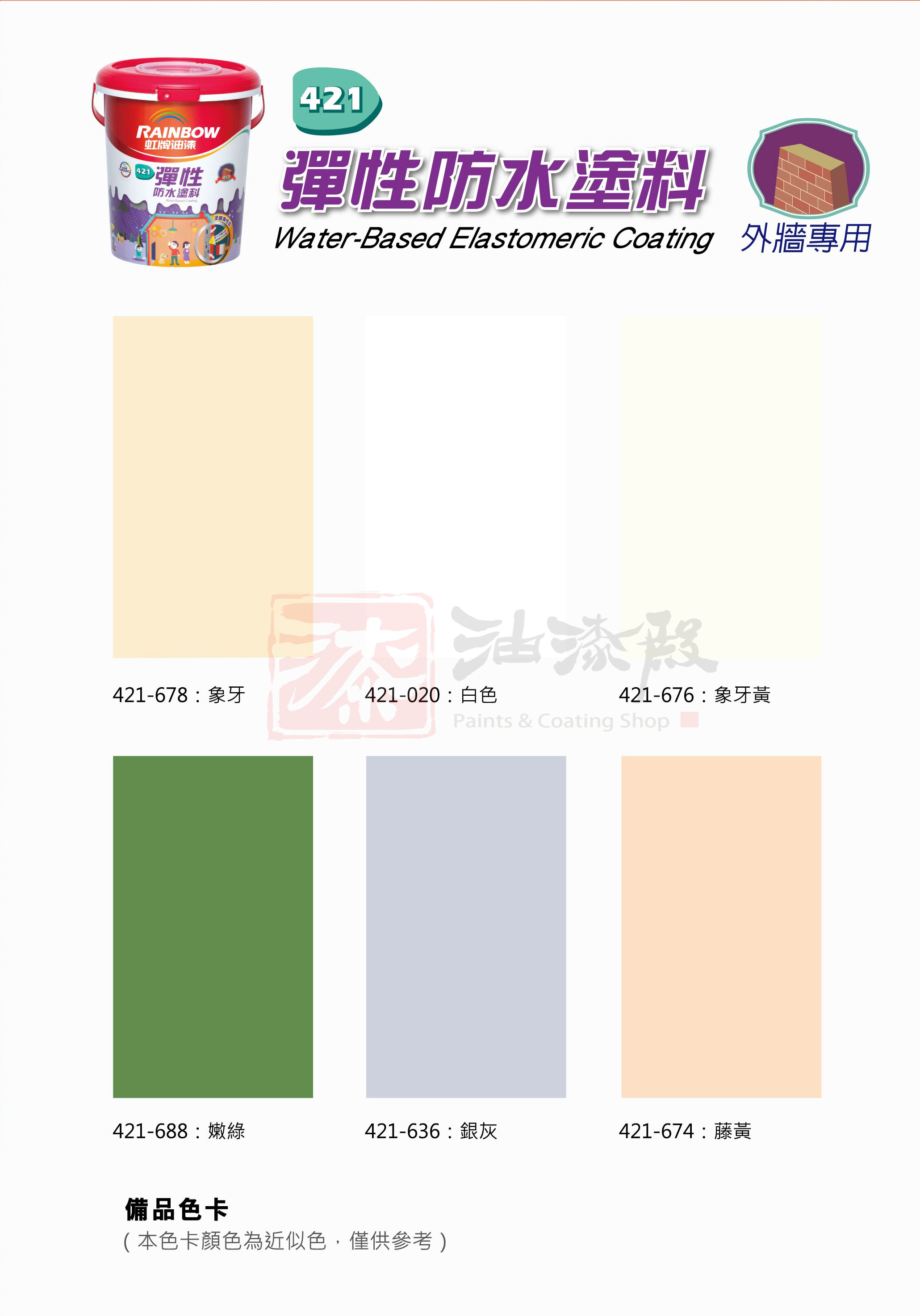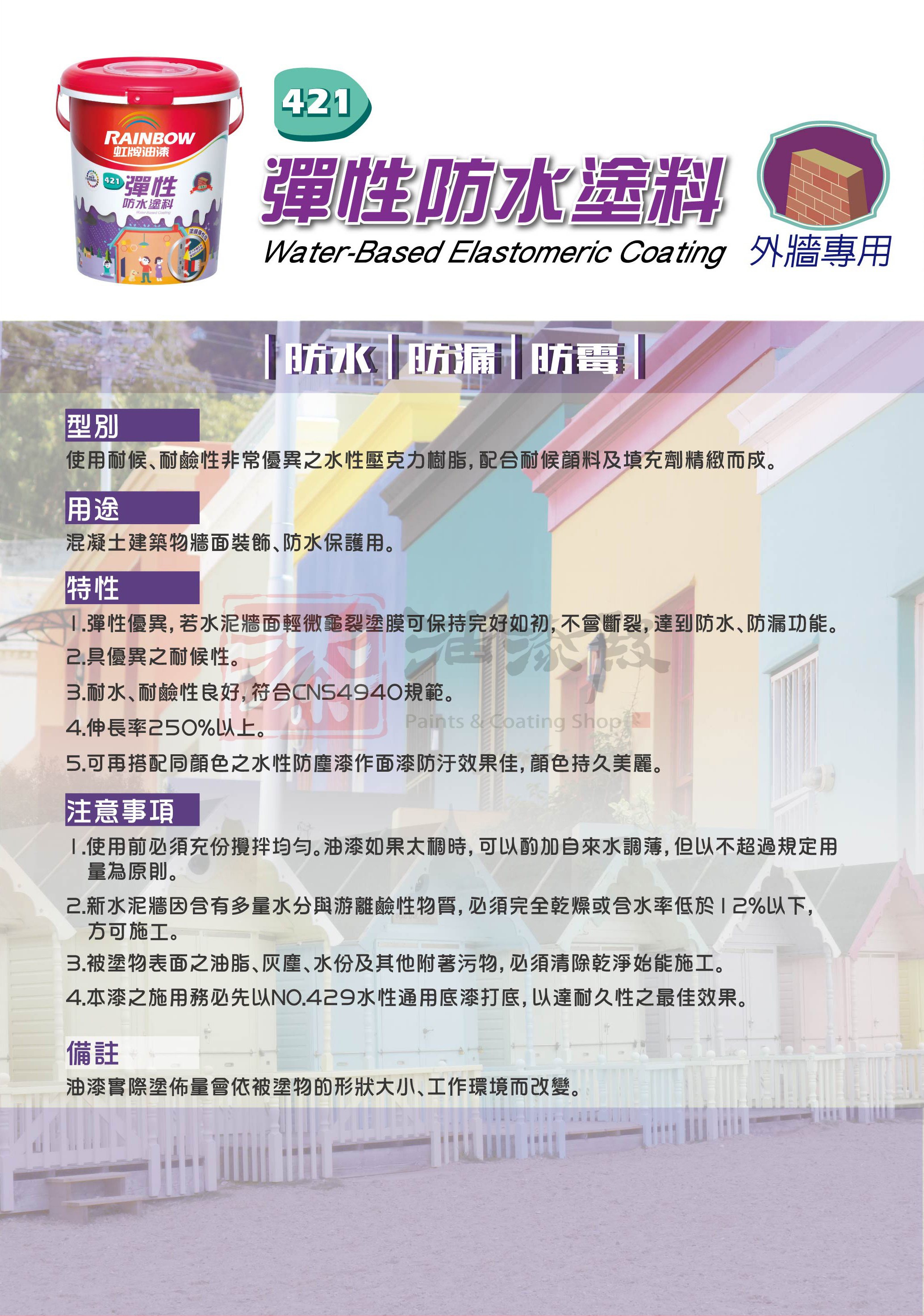 彈性優異的室外專用耐候漆,抗裂不易有裂痕。建議塗布至少2道,1加侖可塗刷4坪(刷2道的面積)。