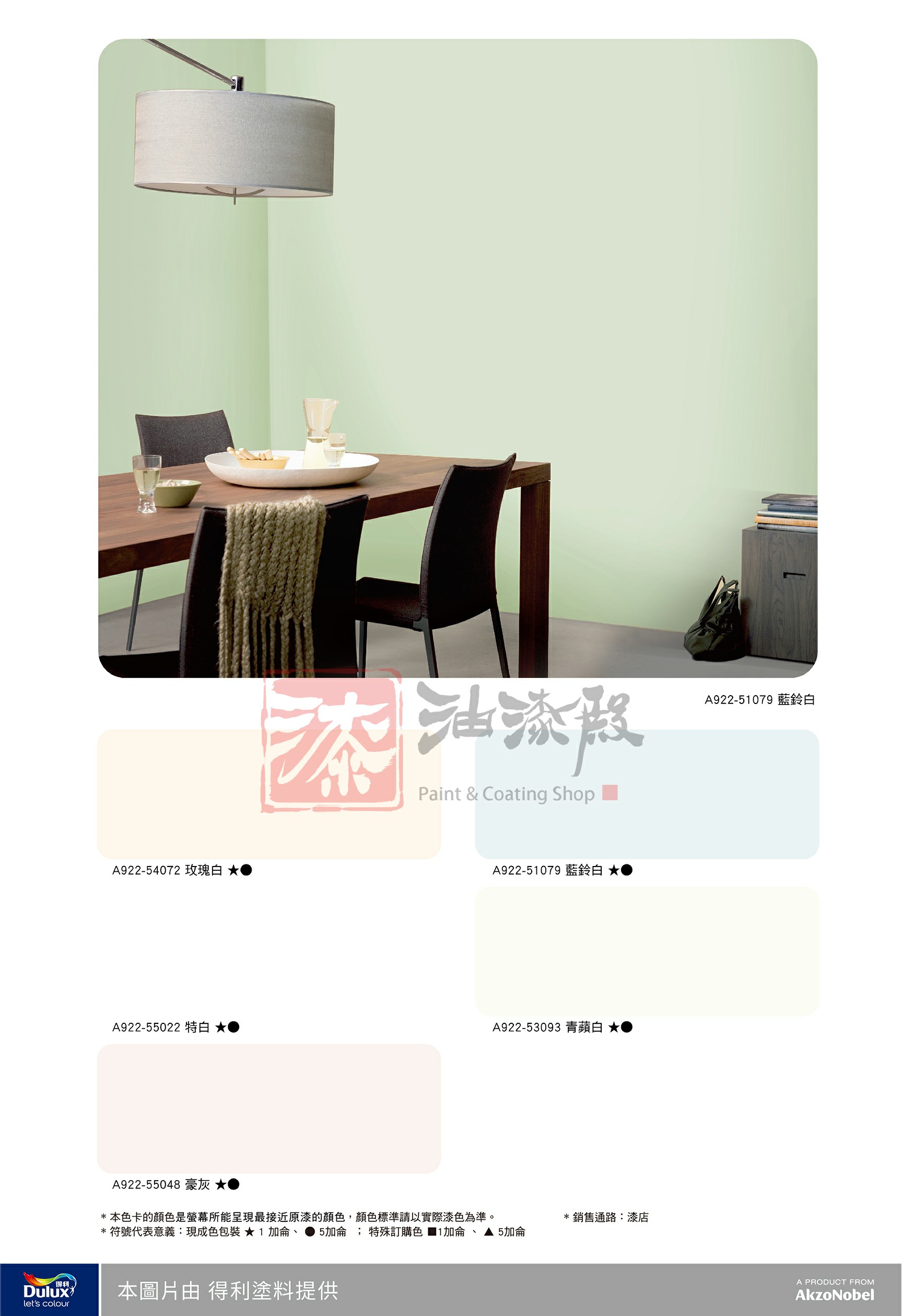 採用底漆+面漆的完整塗刷體系,可以保護底材、增加面漆的附著性及讓色彩更飽和 一般牆面: 得利全效底漆(1道)+得利面漆(2道以上) 吐鹼、粉化、壁癌等問題牆面:得利防壁癌底漆(1道)+得利面漆(2道以上) |