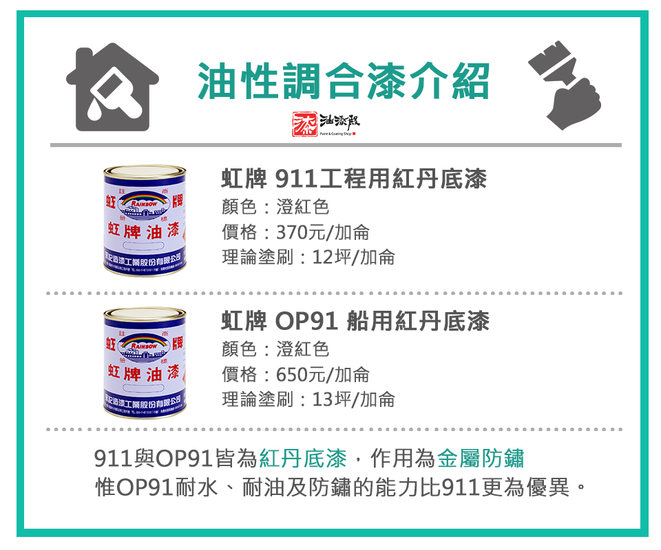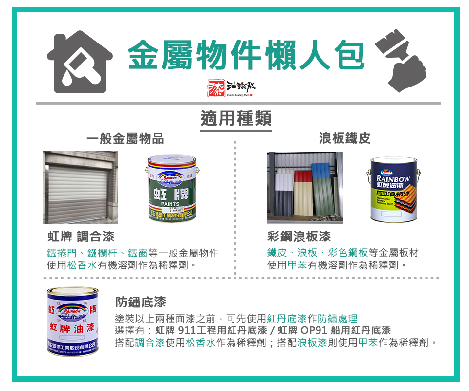 911防鏽底漆需搭配「松香水」或「甲苯」作為稀釋劑,可減緩金屬物件生鏽,請注意防鏽底漆不能作為面漆使用,曝露在表面不耐久。理論塗佈面積(1道):12 坪/加侖,建議塗布至少1道。
