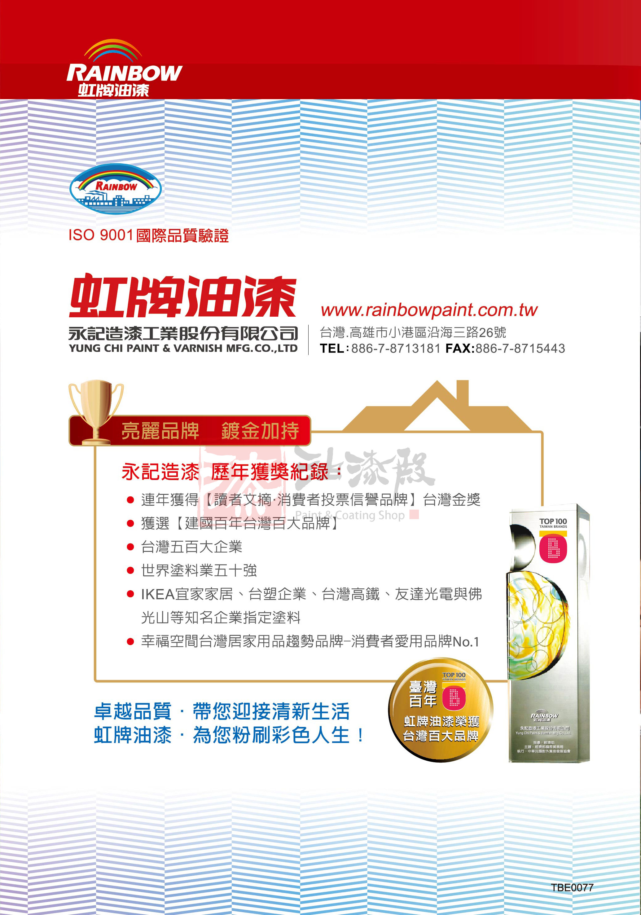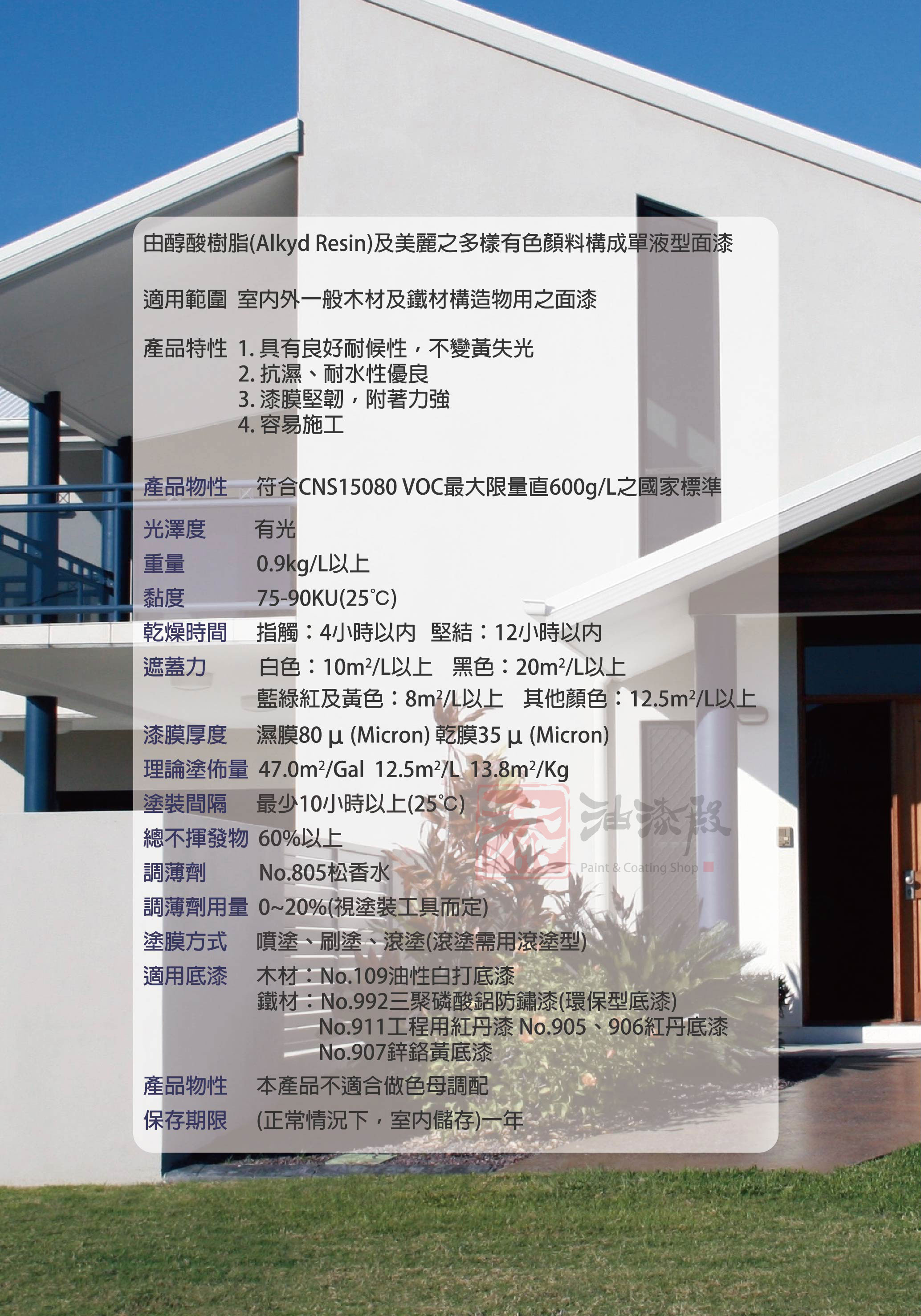 調合漆適用於室內外一般鐵件、木材表面,需搭配「松香水」作為稀釋劑,具良好耐候性不易變黃失光。建議塗布至少2道,1加侖可塗刷8.5坪(刷2道的面積)。