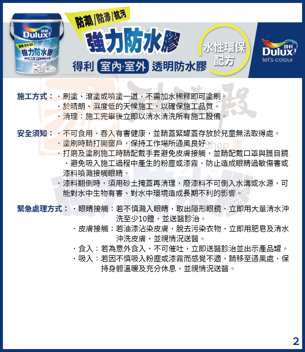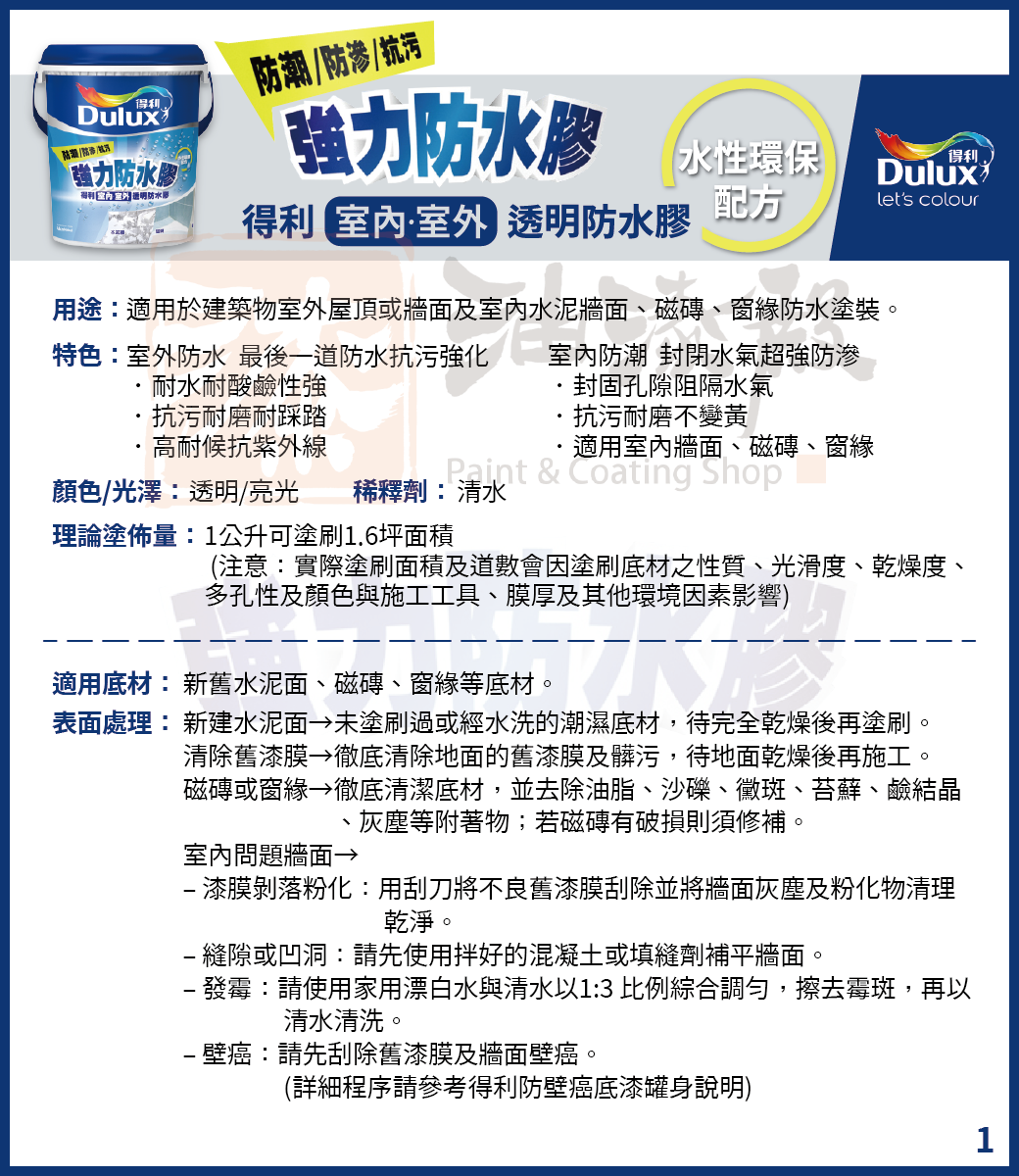 【產品描述】適用於建築物室外屋頂或牆面及室內水泥牆面、磁磚、窗緣防水塗裝。